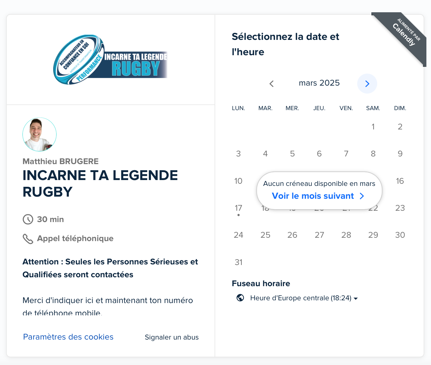 Lors de cet appel téléphonique, nous allons mettre en lumière si nous sommes faits pour travailler ensemble et si je suis la bonne personne pour t'accompagner au quotidien à t'aider à améliorer tes performances sportives et à réaliser ta transformation définitive pour vivre la carrière de rugby que tu as réellement envie de vivre aujourd'hui.