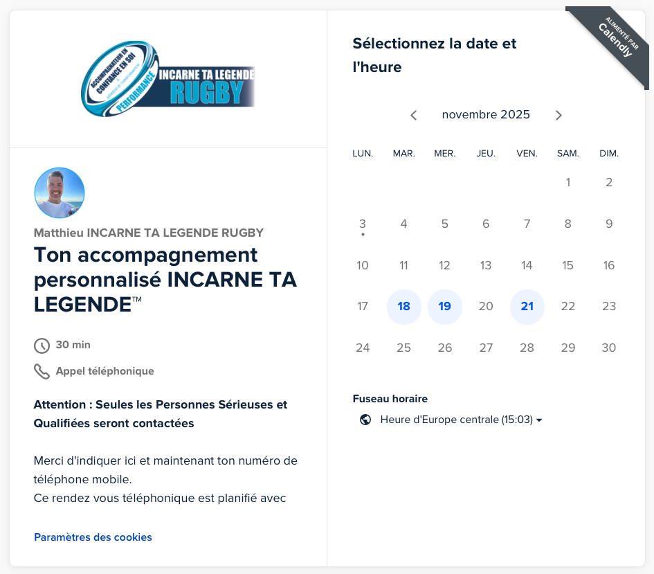 ✅ Pour être aujourd'hui libre d'exprimer tout ton plein potentiel à chaque match et ainsi te rapprocher avec plus de fluidité vers ton but celui de vivre la carrière de rugby qui t'inspire au plus profond, tu as l'opportunité de vivre ici et maintenant ton accompagnement personnalisé de transformation INCARNE TA LEGENDE™ avec dans un premier temps un rendez vous téléphonique avec moi-même Matthieu pour en discuter ensemble.